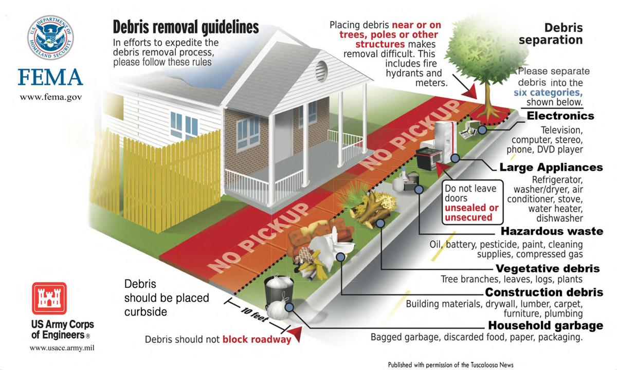 When cleanup efforts start, we encourage homeowners to separate debris at the curbside. This will speed up and protect the debris removal process. Please be safety aware when handling dangerous debris. Separate the debris into the following categories: